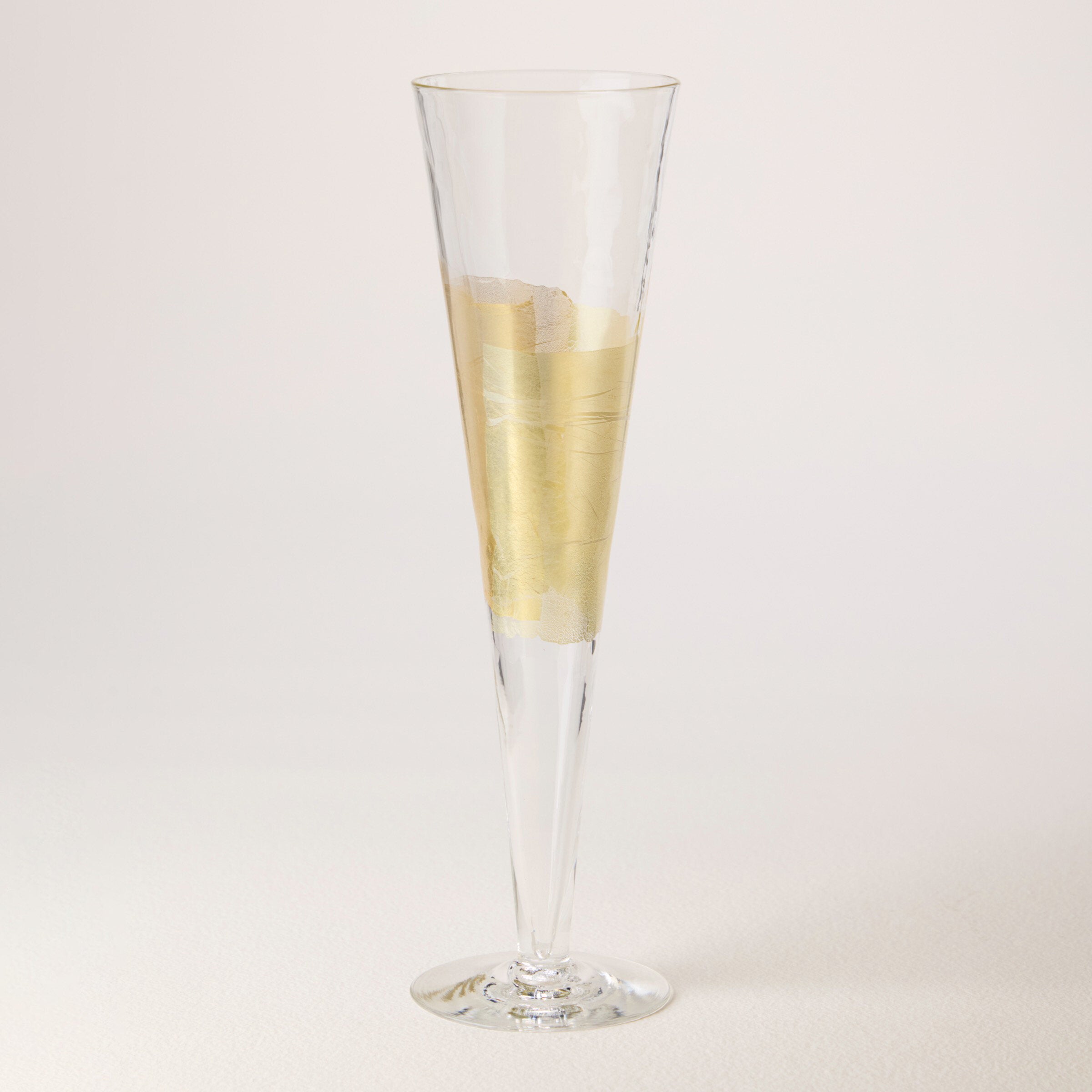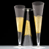In his line of drinkware, 23k gold and 12k white gold leaf is rolled on and fused to the glass bubble while the vessel is being blown. A delicate folding and expanding of the leaves make each piece unique. The surface of the glass is formed in graphite and metal molds to produce a rippled texture, accentuating the reflections of the gold.