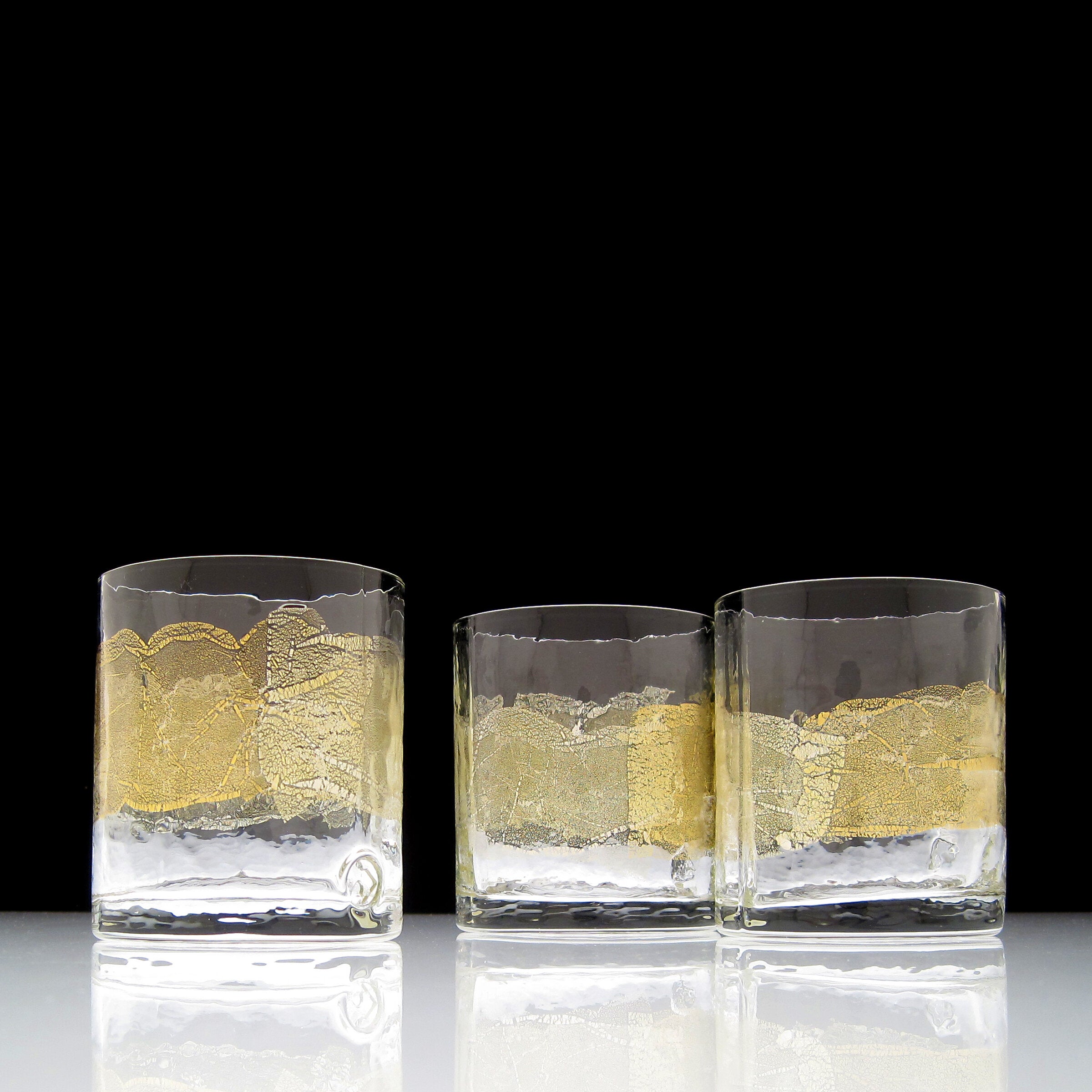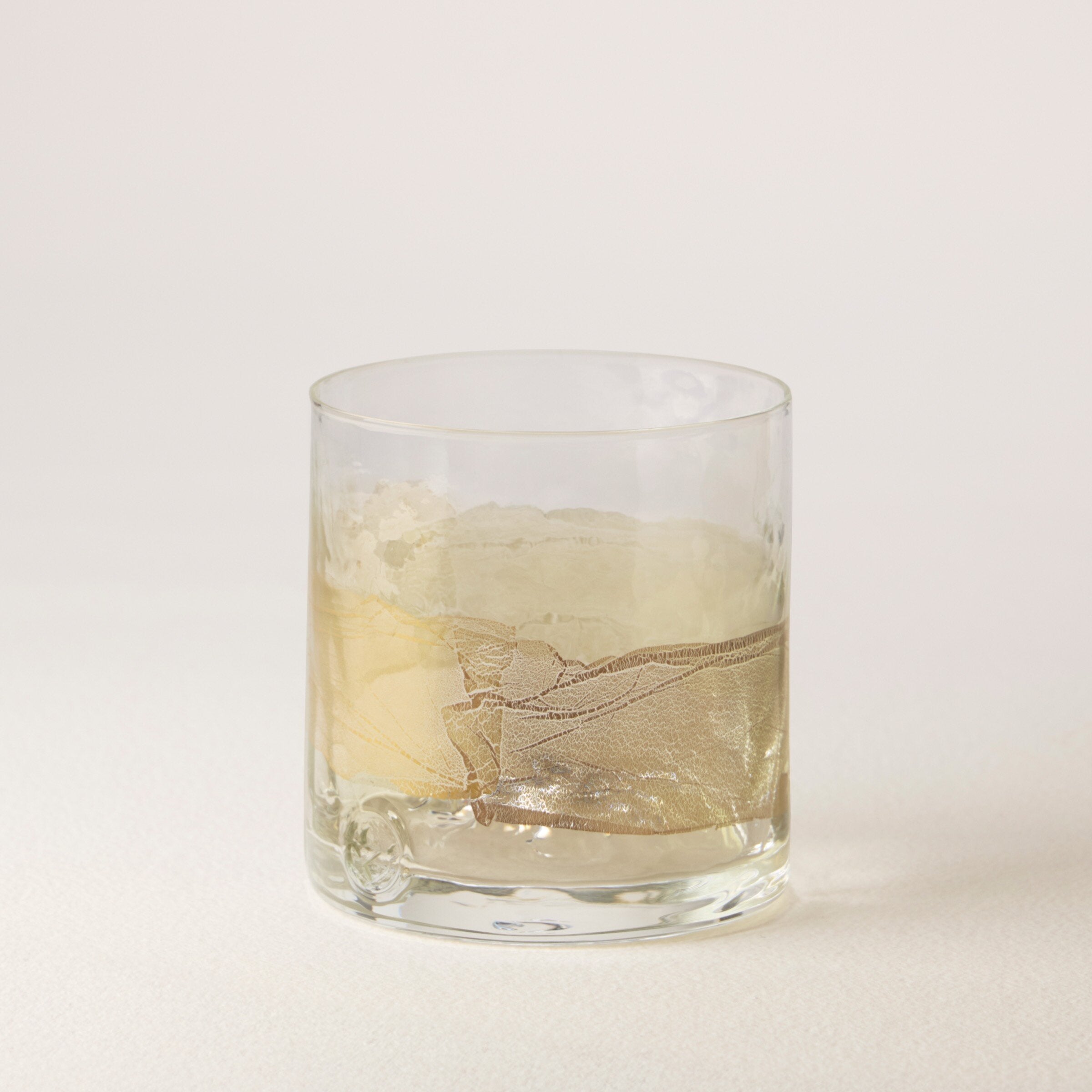 In his line of drinkware, 23k gold and 12k white gold leaf is rolled on and fused to the glass bubble while the vessel is being blown. A delicate folding and expanding of the leaves make each piece unique. The surface of the glass is formed in graphite and metal molds to produce a rippled texture, accentuating the reflections of the gold.