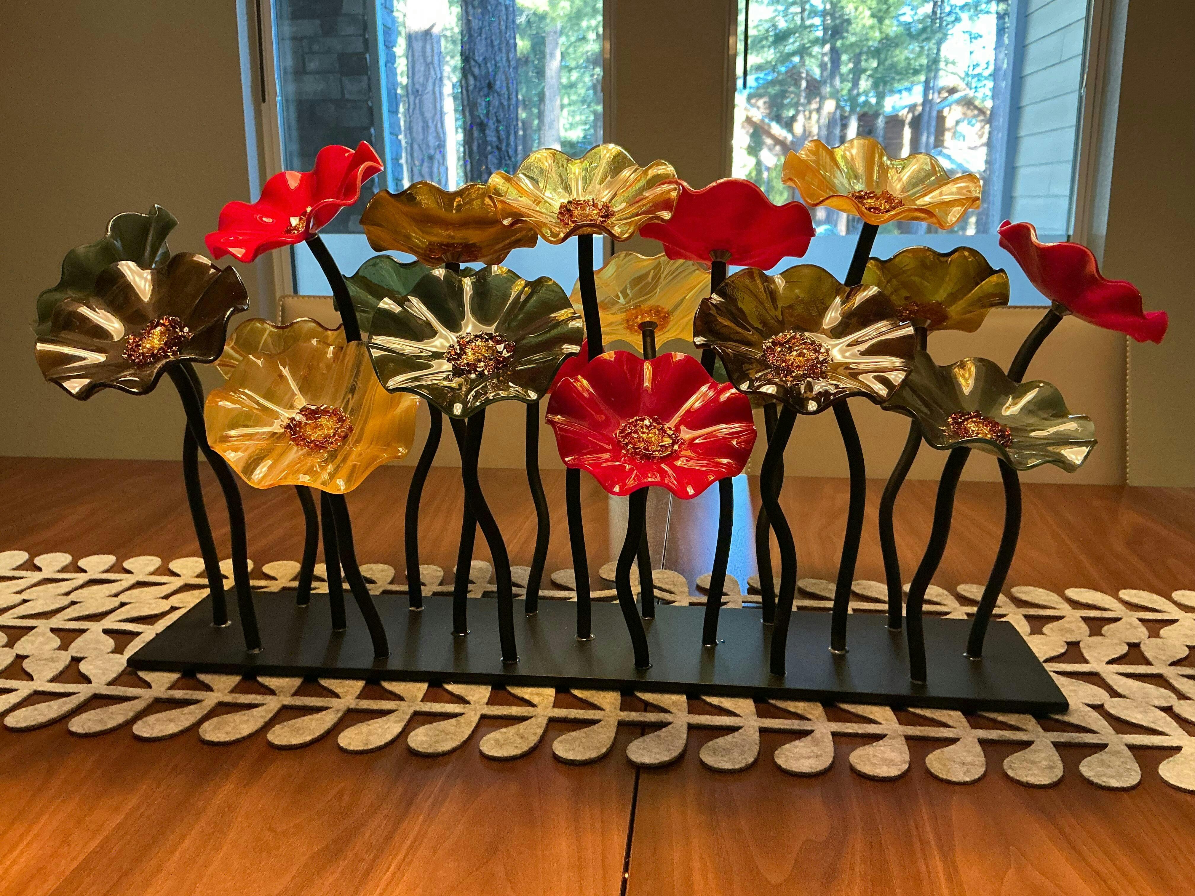 In the studio, Johnson kiln-forms and cold-works the glass into contemporary free-form flowers in a wide variety of colors. Copper and aluminum are hand sculpted in flowing motion to compliment the flower shapes, then attached to formed metal bases.