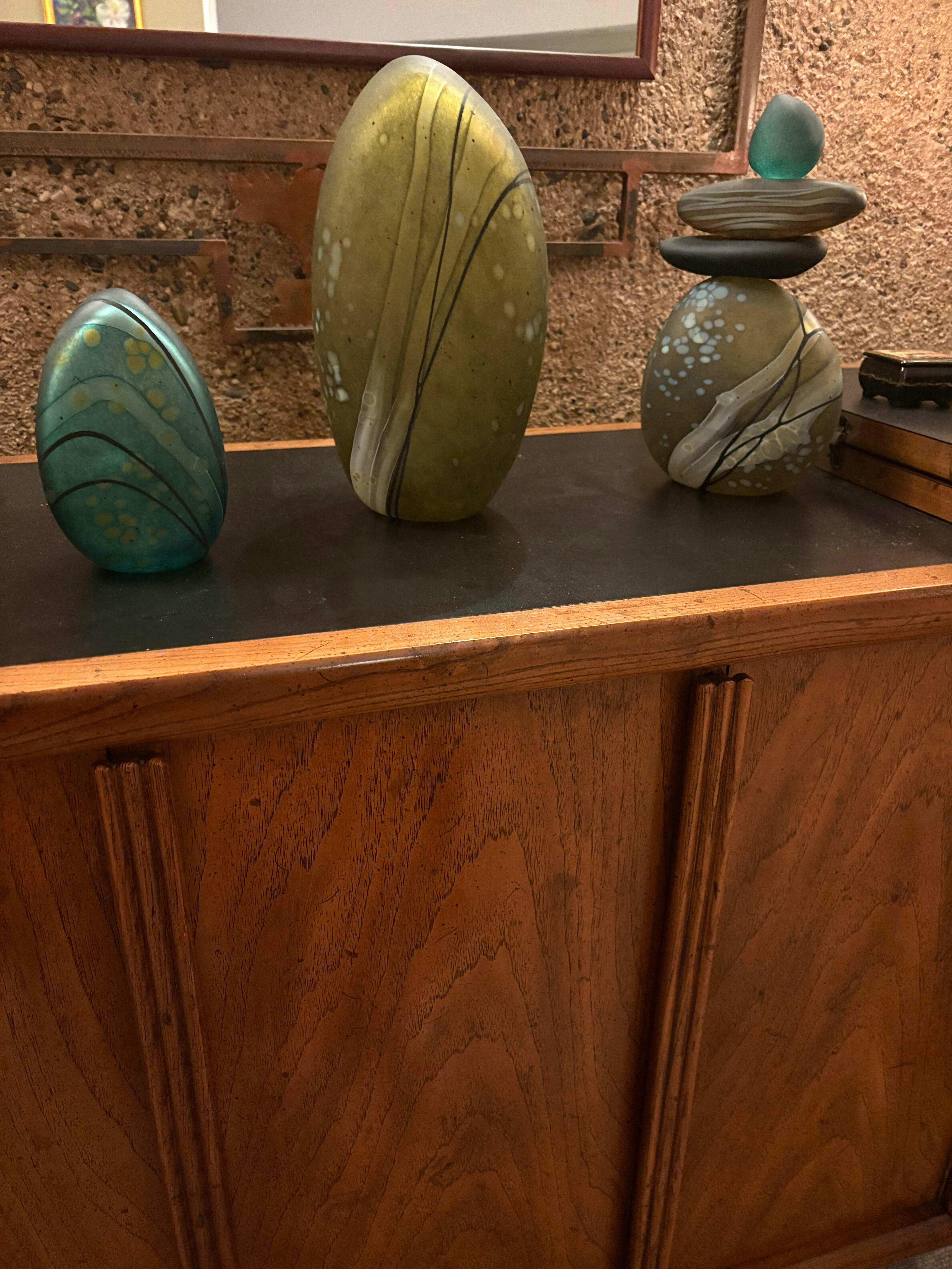 This grouping is crafted to capture the beauty of sunlight trickling through the trees onto moss covered stones that have sat creekside for years as their furry carpet developed. Each glass stone and cairn is individually formed and fused together in flame. After shaping the glass is annealed, which is a slow cooling process that relieves stresses in the glass, they are ground to assure a stable bottom and finally etched to create the stone like satin finish. The beautiful translucent colors will show at their best with lots of ambient light or directional back lighting. To maintain their beauty they my be simply dusted or carefully rinsed in lukewarm water then thoroughly dried. This particular grouping may be arranged to your liking. Dimensions refer to the trio when displayed as shown.