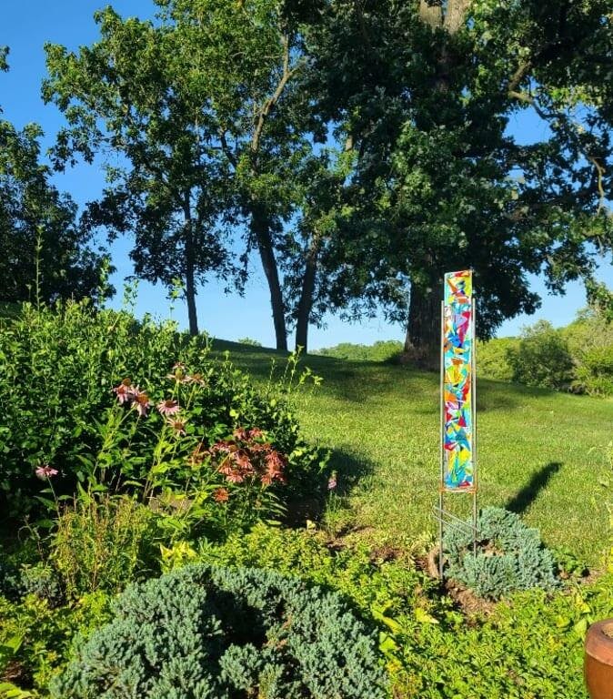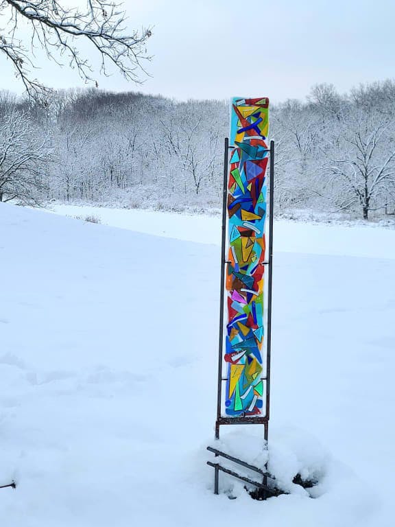 Helen Rudy came to creating beautiful fused glass pieces from a non-traditional background in construction management. Her attention to color detail, layering, and saturation heralds back to her degree. Her crisp and clean designs clearly focus on the interaction of light and its effect on the glass.
