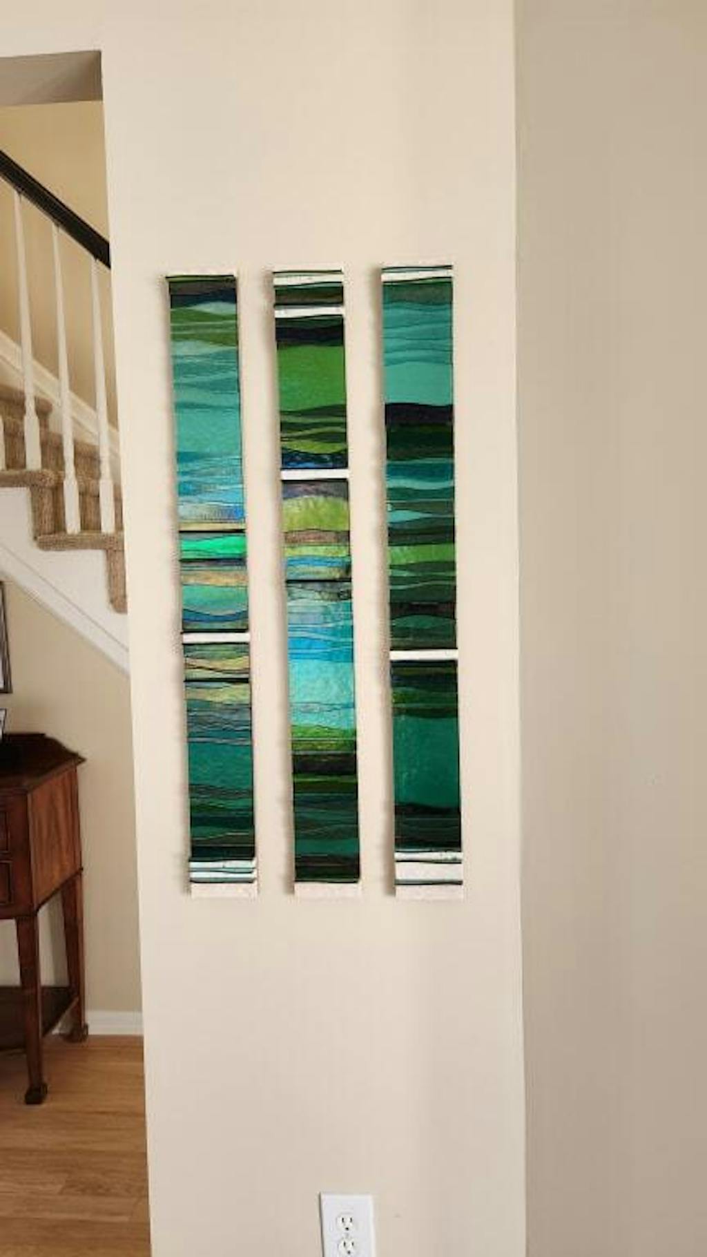 Kelemen creates her art by drafting manually each piece to scale to combine the mosaic technique, using travertine stone with Kiln-Formed glass. Her technique is created by incorporating multi-layers collages of fused glass, flat glass, color mirror accents and copper gold wiring and cut stone.
