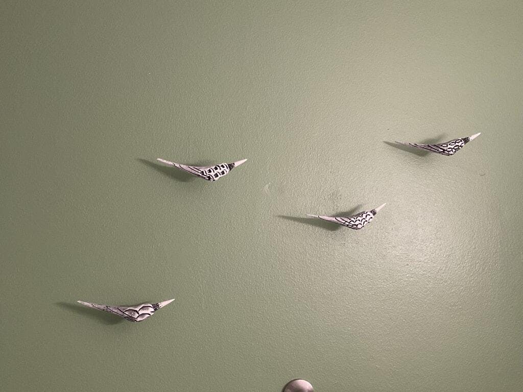 Thoem uses high-fire stoneware and porcelain clays to create both framed and unframed wall installation pieces. Her work is hand built and kiln fired multiple times using slips, stains, and glazes on highly textured surfaces. By permanently attaching a steel wire stem to the back of each individual ceramic piece, she is able to integrate depth and shadow into the design of her work.