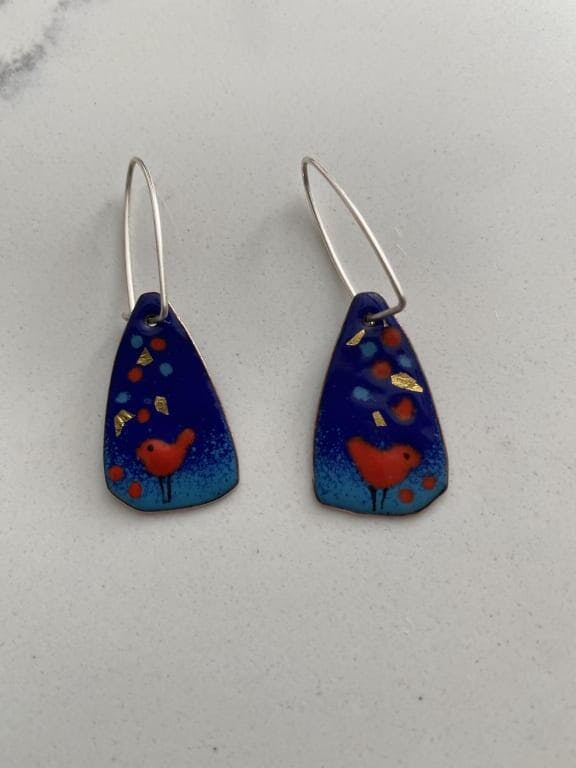 These earrings feature a sweet little red bird sitting atop a gorgeous cobalt ombre background. Hand-cut copper is enameled in layers and fired in a kiln; the bird is created by wet packing grains of enameling glass and firing. The earrings hang from a handcrafted Argentium silver ear wire that mimics the organic triangular shape of the dangle, while a hook closure keeps everything secure.