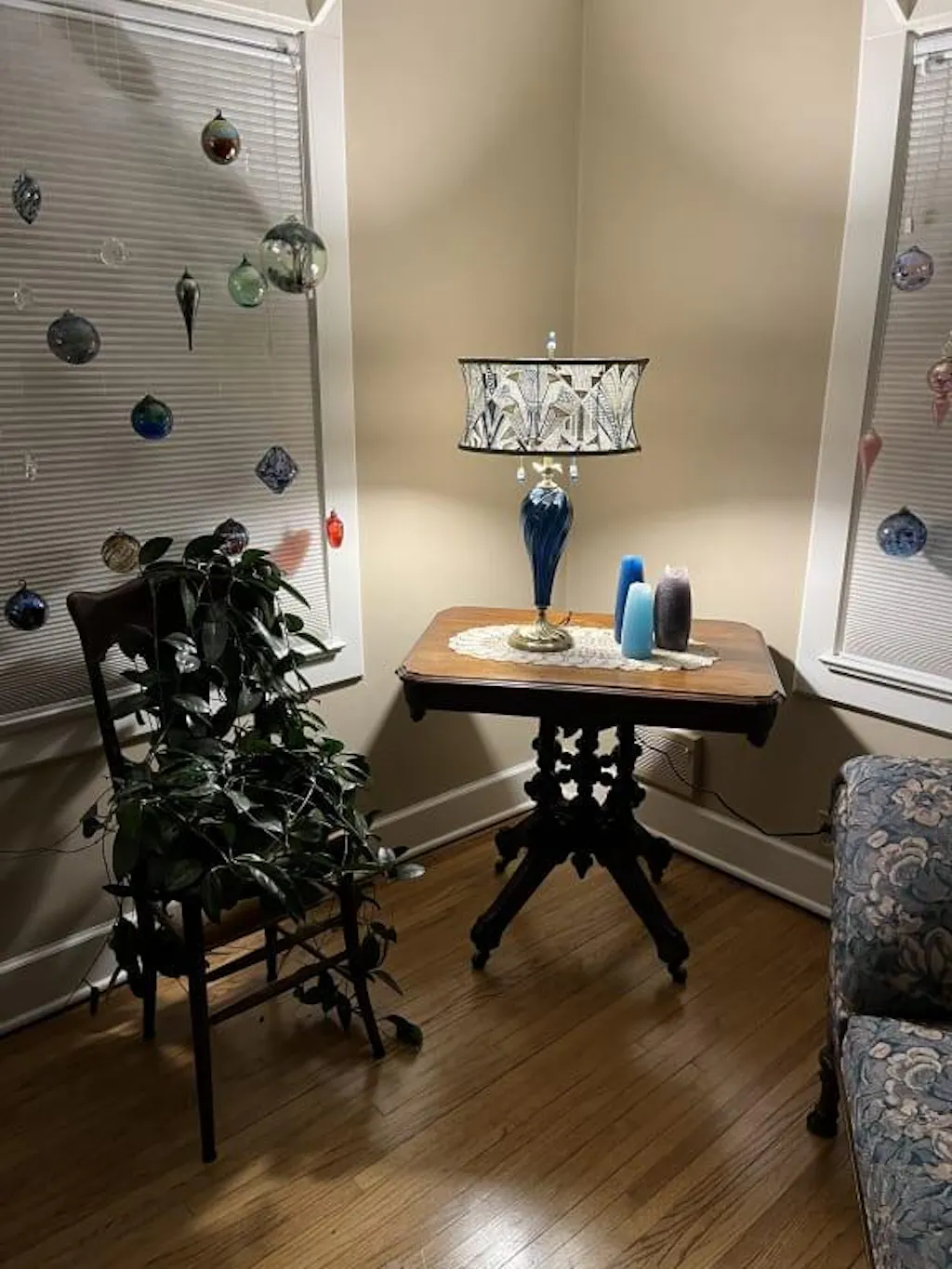 Susan and Caryn work together to create each of their lamps. They incorporate proprietary elements with vibrant glass (blown by two glass studios) and solid brass and copper accents. The lampshades are deeply colored and sewn from embroidered silks and rich fabrics. The lamps are individually finished with patinated metals and surface textures that will not fade or discolor, and are topped with distinctive finials.