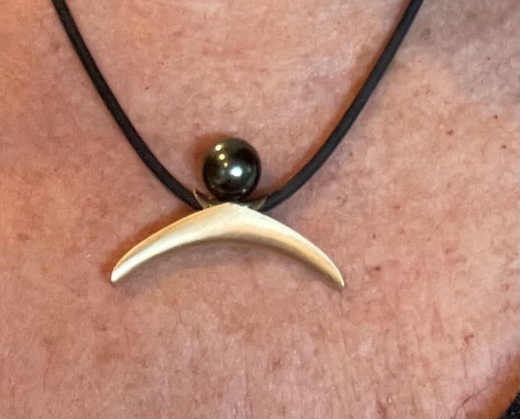 This striking pendant is hammer-raised and fabricated from two different 14k gold colors to create contrast. The lustrous, round Tahitian pearl is 9.5-10mm and the .10ct diamond is bezel-set in platinum. Silicone cord available in 17", 18",or 20".