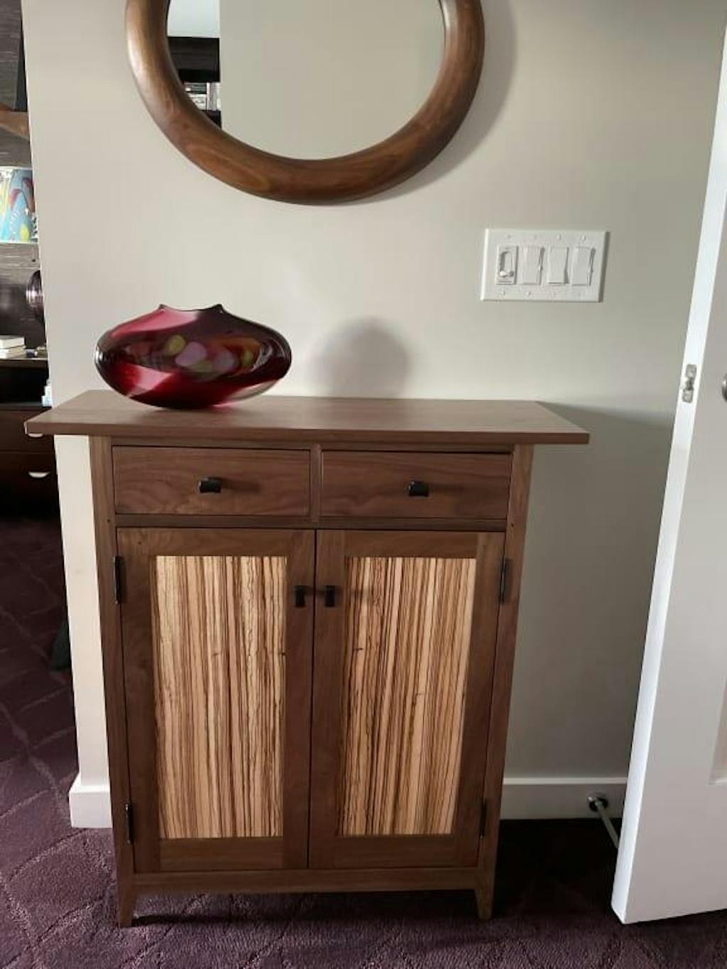 Expert craftsmanship and a simple, Shaker-inspired design highlight the rich grain of solid walnut and zebrawood. Mortise and tenon joinery and pegged construction ensure that the piece is both well-built and beautiful. Two drawers with aromatic cedar bottoms. Two adjustable shelves inside. Oil-rubbed bronze pulls.